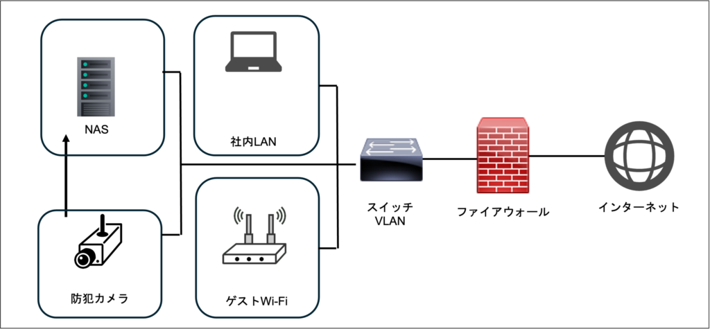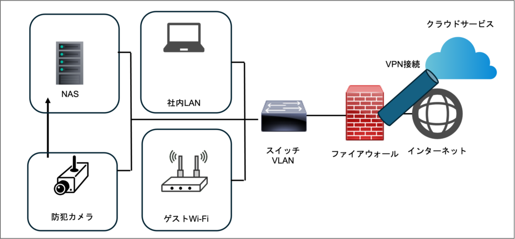 この構成では、用途ごとにネットワークを分けることで、万が一の被害を最小限に抑えることができます。